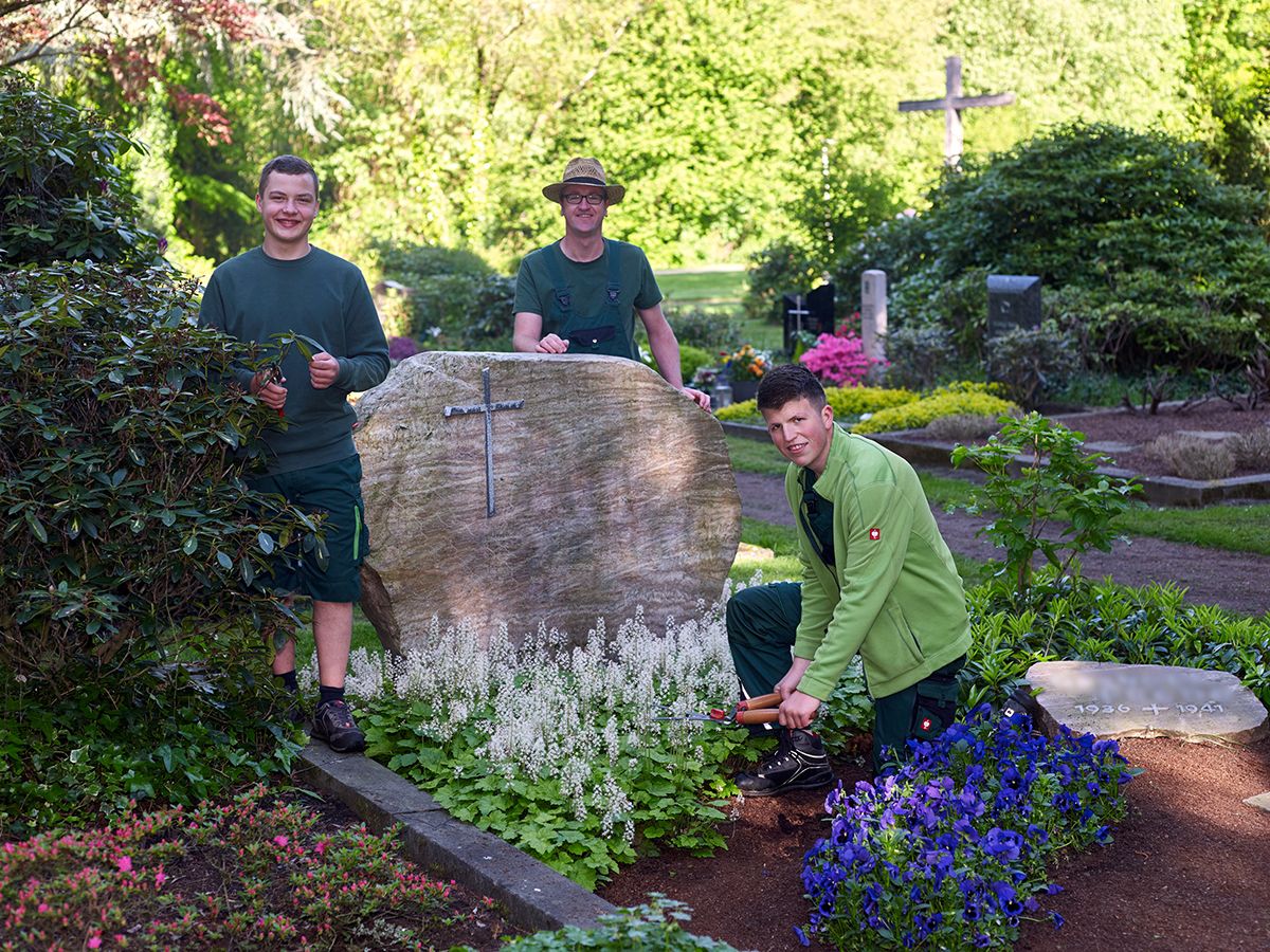 Auf die beiden Auszubildenden im zweiten Lehrjahr warten insgesamt 73 Mustergräber und eine neuartige Gemeinschaftsgrabanlage „NaturRuh“. Aufgabe wird es sein, die komplette Anlage fachmännisch zu pflegen und IGA-Besuchern Fragen rund um die Grabgestaltung sowie zum Beruf des Friedhofsgärtners zu beantworten.