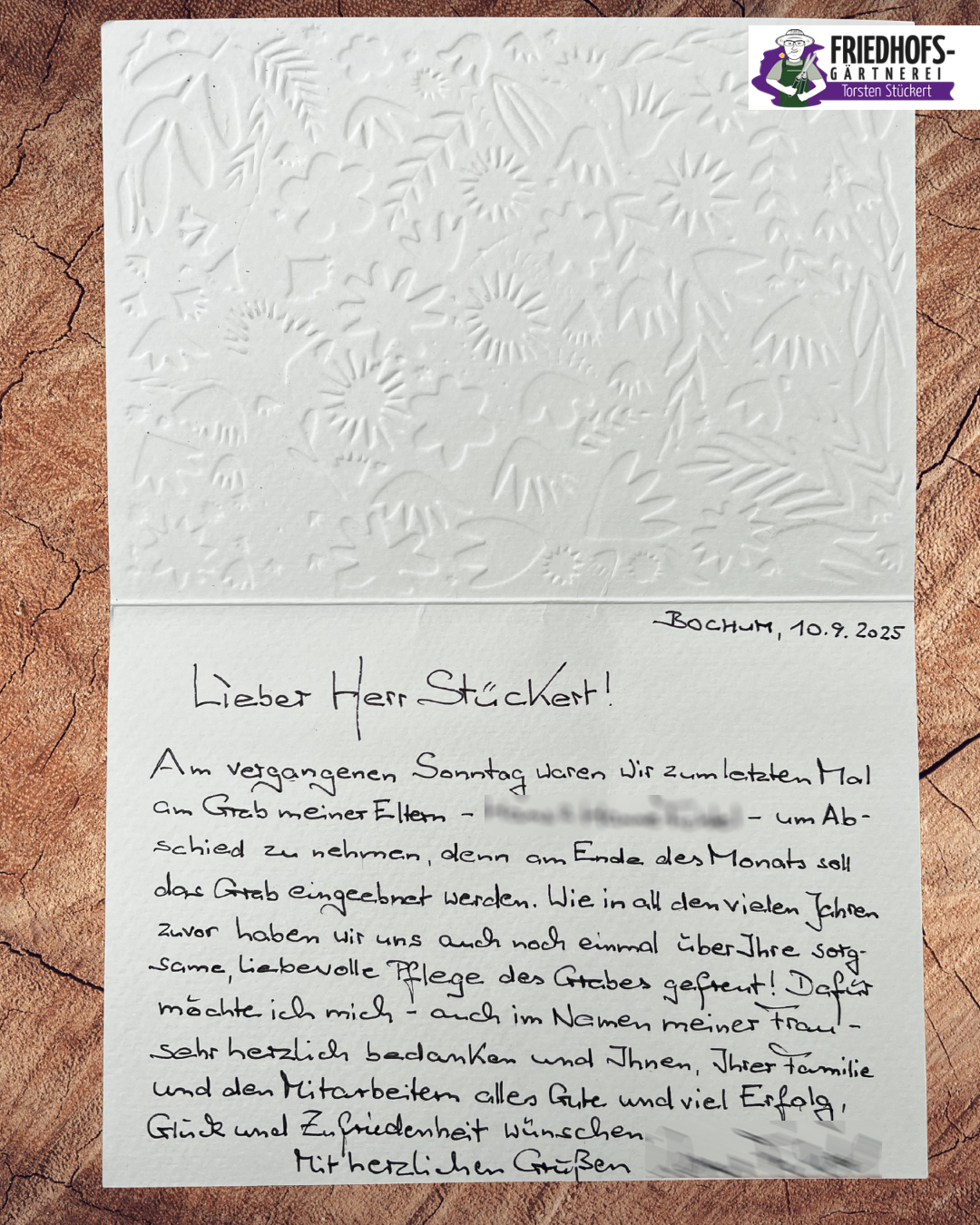Heute hatten wir einen echten Gänsehaut-Moment: Ein Kunde aus dem Ruhrgebiet hat sich bedankt für die zuverlässige Grabpflege, die wir über viele Jahre für seine Familie übernehmen durften.