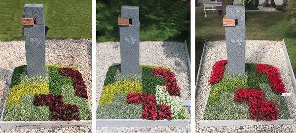 Das Urnenwahlgrab von Torsten Stückert auf der BUGA 2019: Sowohl die Bepflanzung im Frühjahr (links) sowie die Sommerbepflanzung (mitte) wurden mit Silber ausgezeichnet. Für die Herbstbepflanzung (rechts) gab es "Gold".