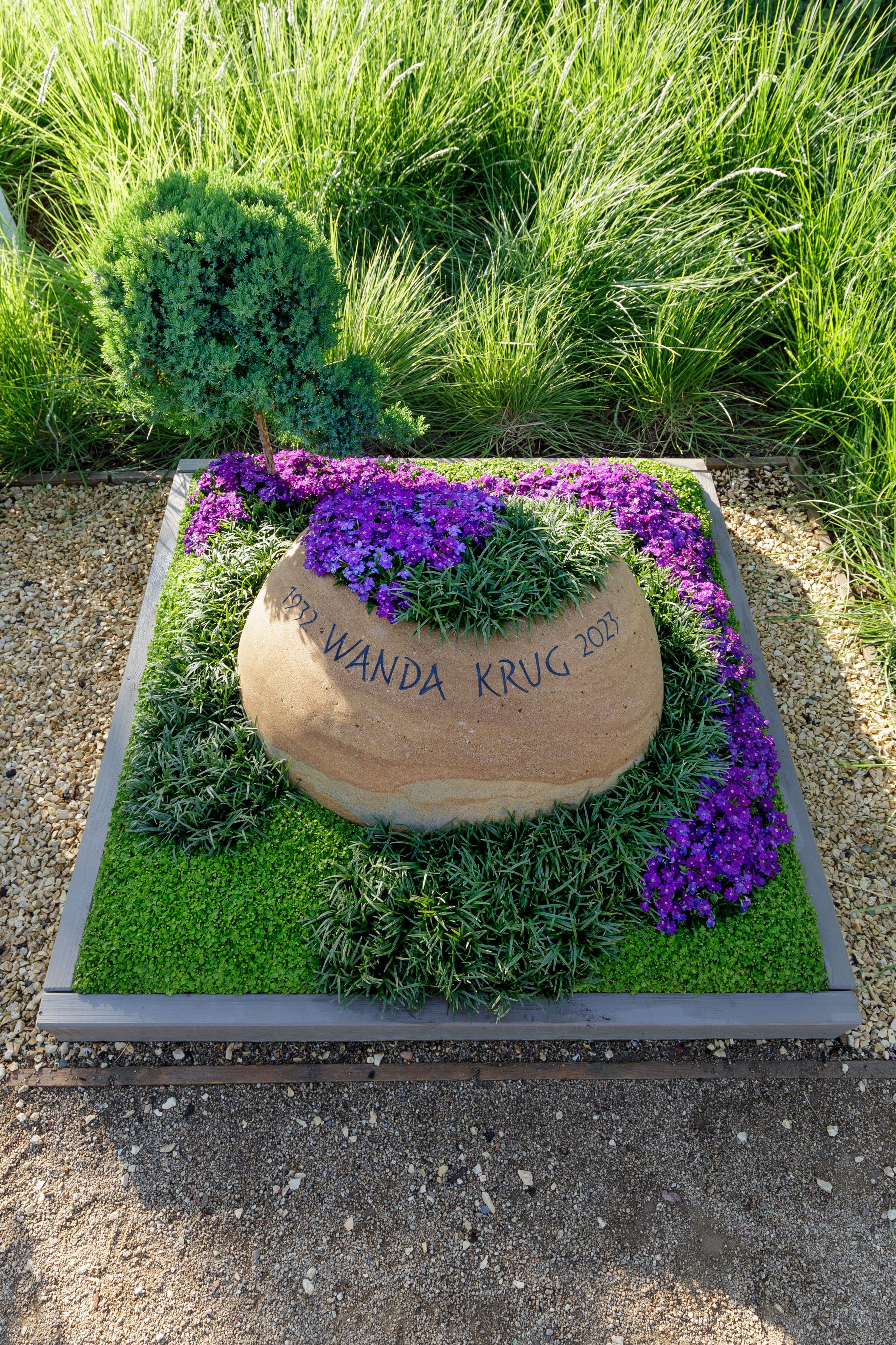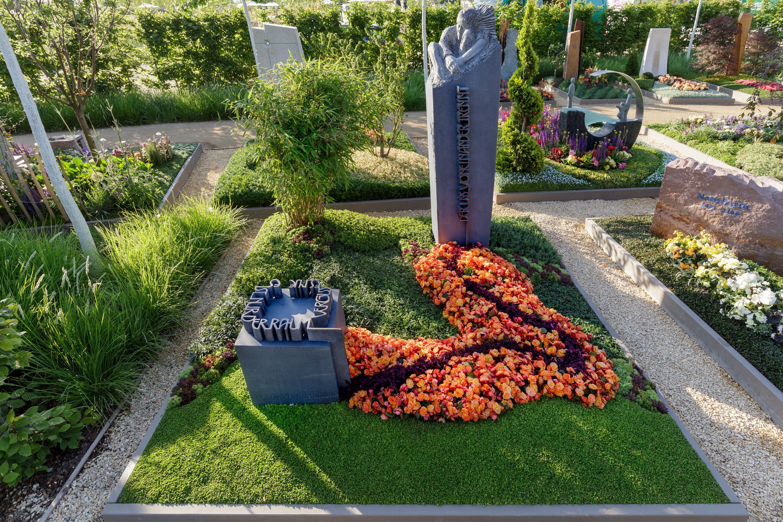 Wie im Frühjahr benötigte dieses Grab wieder die größte Aufmerksamkeit. Die Bodendecker bekamen weitestgehend einen Sommerschnitt, Japanischer Schlangenbart (Ophiopogon japonicus „Minor“), die kleinblättrige Kriechspindel – Euonymus fortunei „Minimus” sowie Teucrium chamaedrys (Gamander) wurden teilweise neugepflanzt oder ausgebessert. Das Beet selbst bekam auch ein neues Kleid und die Hornveilchen wurden durch die Elatior-Begonie „Catrin“ und Coleus blumei (Buntnessel) ersetzt. Außerdem hatten wir den Bambus (Fargesia nitida „Black Pearl”) bereits Mitte Mai noch etwas eingekürzt und somit einen Kritikpunkt der Jury aus dem Frühjahr aufgenommen, die den Bambus als etwas zu hoch/groß kritisiert hatte. Während es im Frühjahr noch Silber gab, gab es diesmal leider „nur” Bronze: Jetzt wurde der Bambus auf einmal von der Jury als unpassendes Gehölz deklariert und die Beetbepflanzung als zu dicht bemängelt.