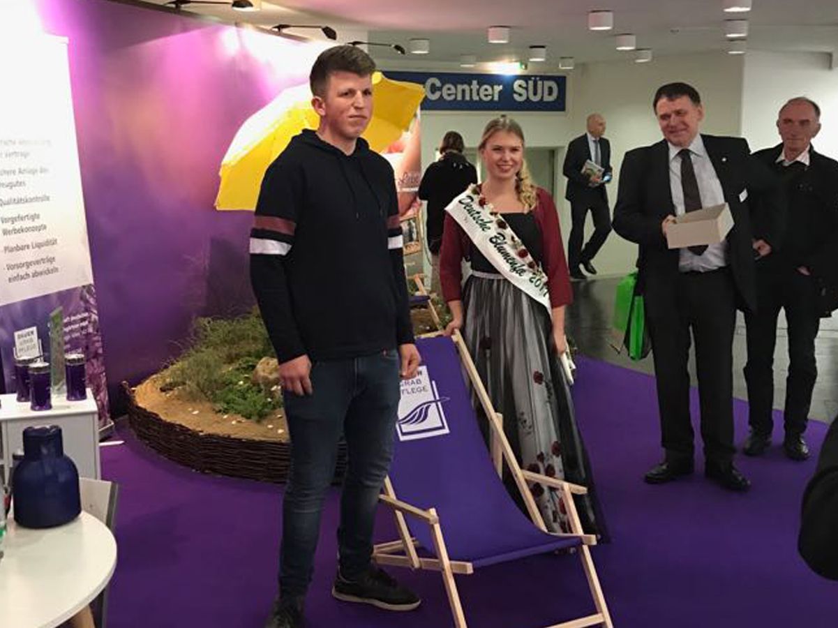 Unser Auszubildener Nick Pagor nutzte die Chance sich über den nächsten Karriereschritt, die Meisterschule, zu informieren und Jonas Albrecht versuchte sein Glück bei der Verlosung am Stand des Bund deutscher Friedhofsgärtner (BDF). Als Nick Pagor alle Informationen für seinen weiteren beruflichen Werdegang zusammen getragen hatte, da zog Jonas Albrecht tatsächlich das große Los, den Hauptgewinn!
